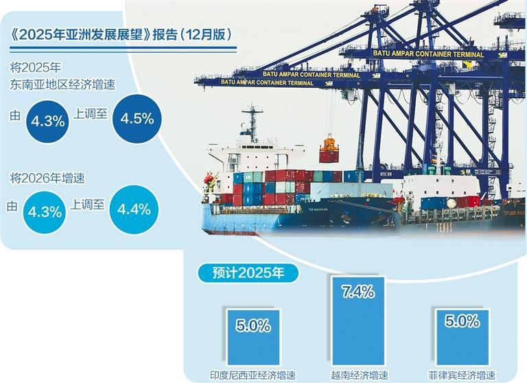国际货币基金组织(IMF)在10月发布的《世界经济展望》中指出,东南亚地区仍是全球增长最快的次区域之一,对全球经济增长贡献持续上升。亚洲开发银行(以下简称“亚开行”)12月发布《2025年亚洲发展展望》报告显示,受益于外部环境改善及公共支出增加,2025年东南亚地区经济增速将由9月预测的4.3%上调至4.5%,2026年经济增速由4.3%上调至4.4%。