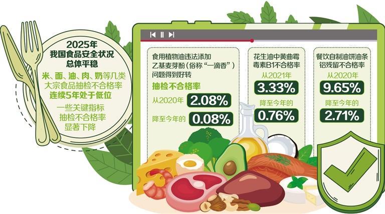 数据显示,截至今年11月底,全国市场监管系统完成监督抽检617.69万批次,检出不合格样品17.23万批次,不合格率2.79%。我国食品安全状况总体平稳,一些关键指标显著改善。同时,相关部门针对农村假冒伪劣食品、校园食品安全、网络食品新业态等领域开展食品安全专项整治,构建起全链条、无死角的监管体系,切实守护群众“舌尖上的安全”。