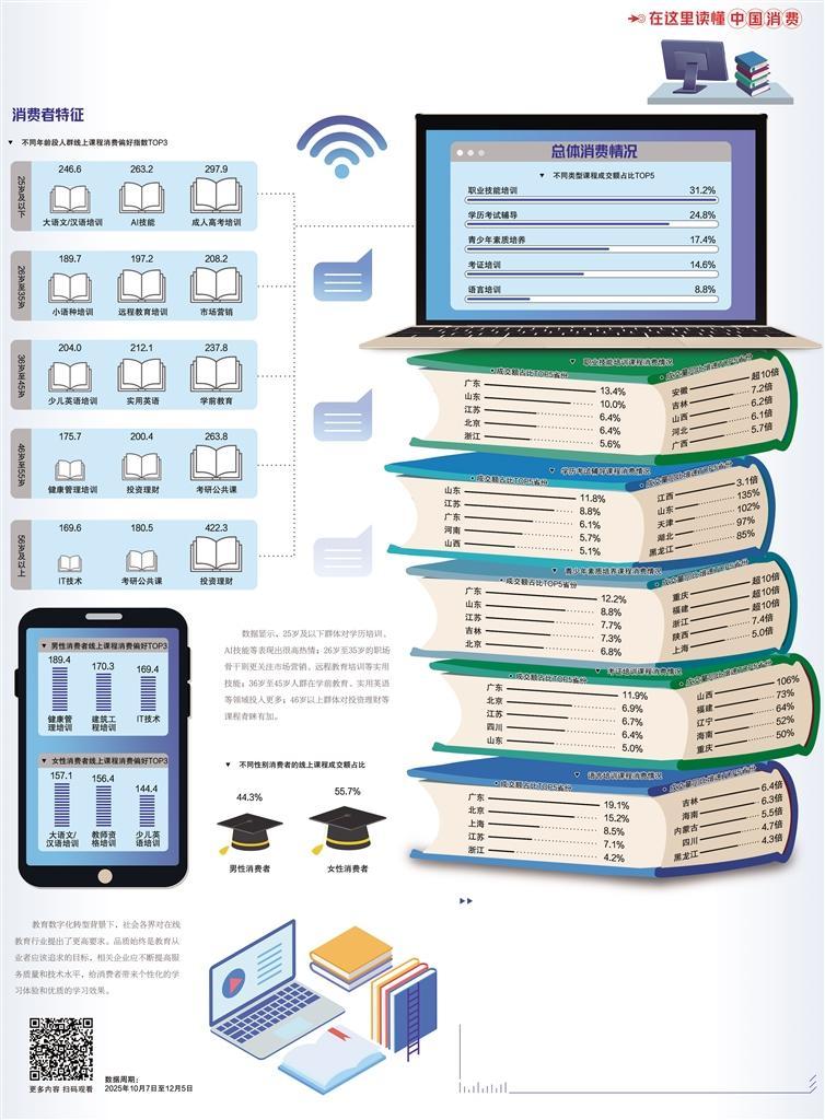 最受欢迎的线上课程是技能类课程。数据显示,职业技能培训以31.2%的成交额占比稳居首位,学历考试辅导以24.8%紧随其后,而青少年素质培养、考证培训、语言培训分别占据17.4%、14.6%、8.8%的市场份额。在产业结构转型升级的背景下,劳动者持续提升专业技能是大势所趋,线上课程不仅内容丰富,还有着无可比拟的便捷性。线上课程消费类型的分布,反映出社会对高素质人才的需求,也呼应了个人对全面发展的追求,形成了供给与需求的良性互动。