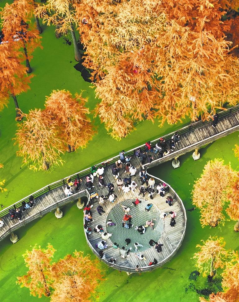 十二月二十三日拍摄的杭州青山湖国家森林公园。近日,该公园近百亩池杉、落羽杉迎来最佳观赏期,鲜艳的水上森林与碧绿的浮萍相映成景,如画般的冬日美景吸引游客前来游览观光。龙 巍摄(中经视觉)