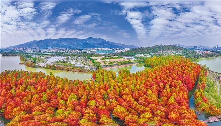 12月28日,广东省肇庆市七星岩景区水杉林迎来最佳观赏期,树冠在冬日暖阳下色彩斑斓,吸引众多市民游客漫步林间赏景、拍照、游玩。