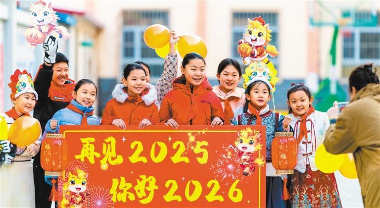 2025年12月30日,内蒙古呼和浩特市玉泉区恒昌店巷小学,学生手持庆祝新年的标语牌合影留念。