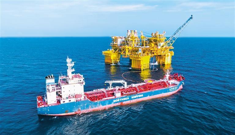 1月2日,据中国海洋石油集团公司消息,我国海上最大气田“深海一号”油气产量2025年突破450万吨油当量,深海气田生产运维技术达到世界先进水平。图为穿梭油轮在平静海况下与“深海一号”能源站对接输油。徐海舟摄(中经视觉)
