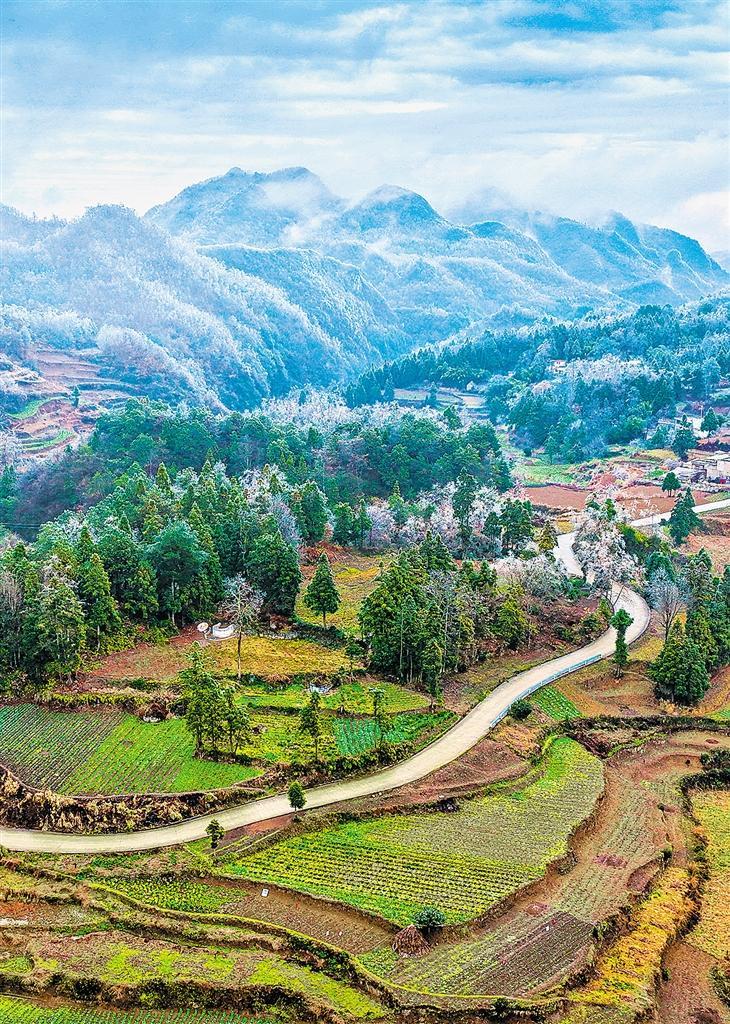 1月4日,受冷空气持续影响,贵州省黔西市高山梯田周围的群山出现雾凇景观,远看如银丝闪烁,景美如画。