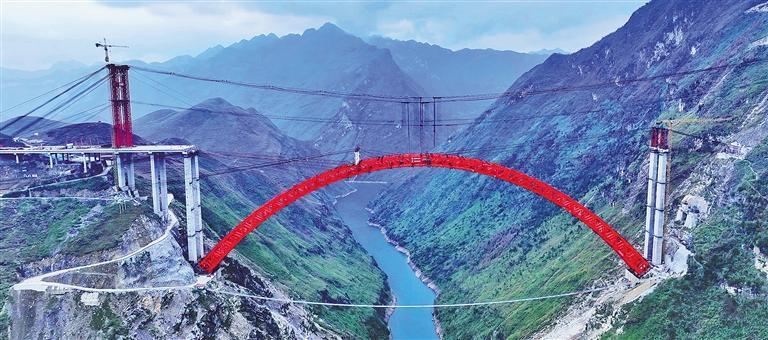 1月5日,由贵州桥梁集团承建的贵州安顺至盘州高速公路古牛河特大桥顺利合龙。古牛河特大桥是安盘高速公路的控制性工程,主桥横跨古牛河,全长881.8米,为计算跨径520米的上承式钢箱桁架拱桥,跨径排同类桥梁世界第二;主桥桥面到谷底高度约400米,在世界高桥中排第15位。