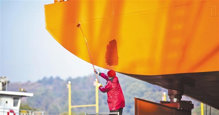 1月3日,江西省九江市都昌县造船总厂船舶制造工地,工人在进行刷漆作业。 傅建斌摄(中经视觉)