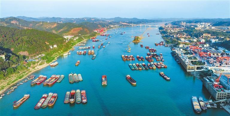 1月4日,珠江上游西江广西梧州市万秀区段,船舶在航道上有序航行。新年伊始,素有“黄金水道”之称的西江迎来航运繁忙季。黎豪图摄(中经视觉)
