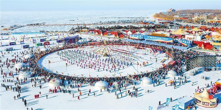 1月8日,吉林·查干湖第24届冰雪渔猎文化旅游节开幕。查干湖上,人工凿冰、冰下走网、马拉绞盘等渔猎技艺有序展开,吸引各地游客前来观赏。本报记者 刘月杨摄