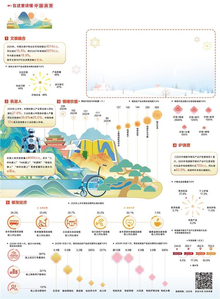 从银发族引领智能产品消费热潮到文旅IP衍生消费撑起旅游市场增长,再到IP联名产品风靡全网,消费市场的活力密码藏在“品质”二字里。当下,消费升级早已不是简单的“买贵的”,而是追求“更好的”。政策保驾护航、产品迭代升级、场景创新增效,政府、生产企业、销售平台等各方协同发力,共同勾勒出品质驱动消费升级的新图景。