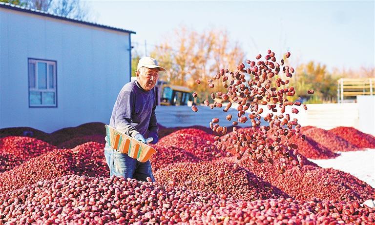 红枣产业也是若羌的一张亮丽名片。23.38万亩优质枣园年产干枣7.34万吨,30余家企业开发出枣醋、红枣素等28种精深加工产品,品牌价值突破51.49亿元,红枣产业贡献了农民人均可支配收入的一半以上,成为名副其实的增收“红色引擎”。