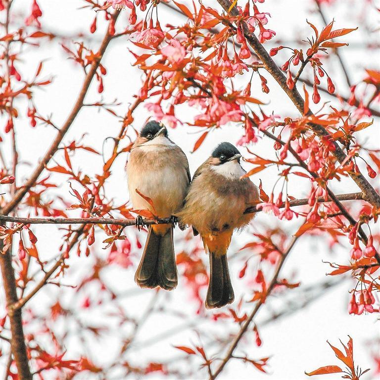 1月8日,重庆市巫山县冬樱花绽放,小鸟在枝头嬉戏。