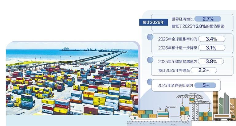 联合国贸发会议日前发布的《2026年世界经济形势与展望》报告指出,尽管美国在2025年大幅加征关税,但在消费支出稳健和通胀回落的支撑下,全球经济表现出超预期韧性,维持了增长势头。然而,深层次的脆弱性依然存在。投资持续低迷和财政空间有限,正在拖累经济活动,并增加了全球经济可能面临长期低增长的风险。报告预测,2026年世界经济将增长2.7%,略低于2025年2.8%的预估增速。