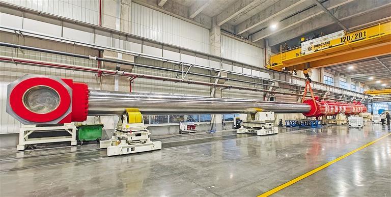 1月16日,由中国铁建大桥局投资建造的超大超长打桩船启闭油缸在江苏恒立液压股份有限公司成功下线。作为打桩船的“心脏”,这台我国自主研发的油缸将装配于在建的156米动力定位打桩船“铁建大桥桩1”号。这是1月15日拍摄的打桩船启闭油缸。(新华社发)