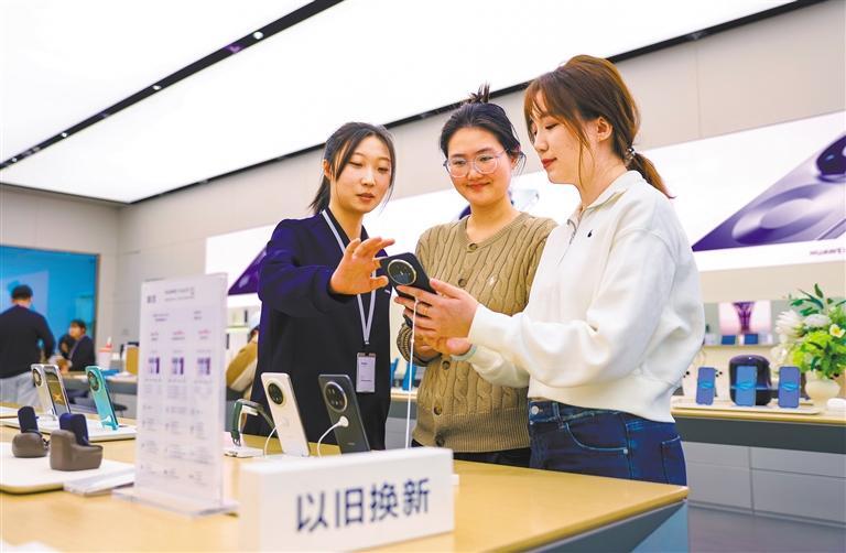 1月8日,山东省青岛市李沧区李村街道一家华为智能生活馆,顾客在了解以旧换新优惠政策。
