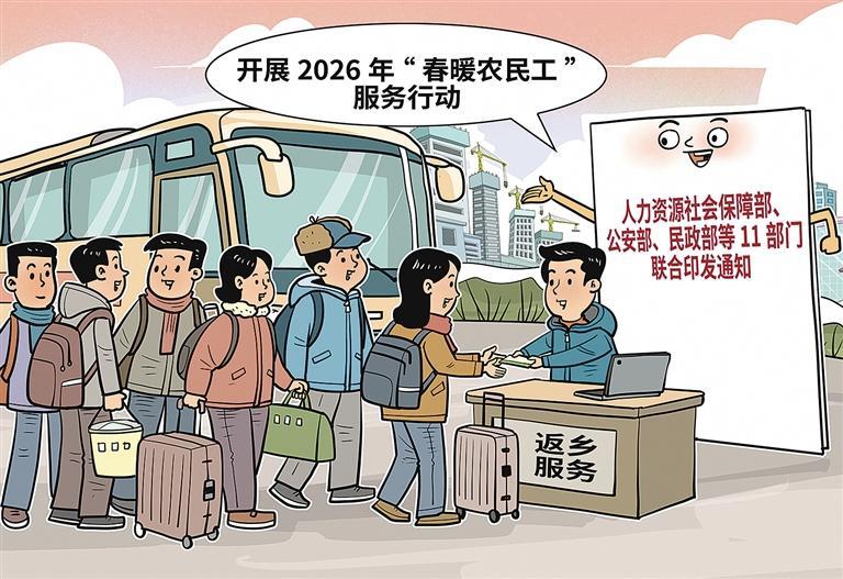 春节前后是农民工集中出行期、换岗高峰期,做好农民工服务保障工作至关重要。人力资源社会保障部、公安部、民政部等11部门近日联合印发通知,部署开展2026年“春暖农民工”服务行动,旨在通过一系列促就业、护出行、保权益的举措,让广大农民工享受到关爱与温暖。须看到,行动涉及的部门多、涵盖的服务广,无论是开通农民工返岗班车、保障失业农民工基本生活,还是解决农民工遭遇的突发性生活困难等,单靠各级政府和企业是不够的,还需广泛动员各方面力量参与其中。只有多方联动、形成合力,将各项部署落实到位,才能把暖心事办到农民工心坎上。(时 锋)