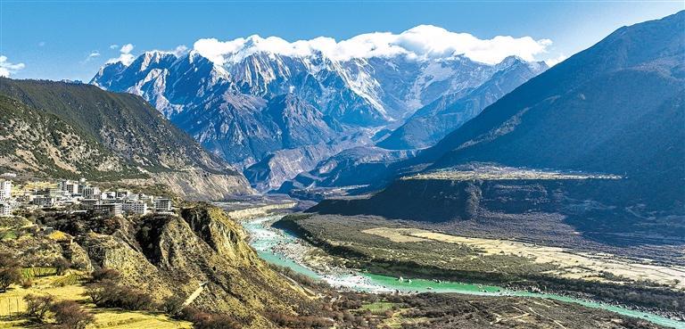 1月29日,西藏自治区林芝市米林市派镇索松村的雅鲁藏布大峡谷,蜿蜒的雅鲁藏布江穿行于险峻峡谷间。南迦巴瓦峰巍然屹立,雪山胜景吸引游客纷至沓来。颜桂海摄(中经视觉)