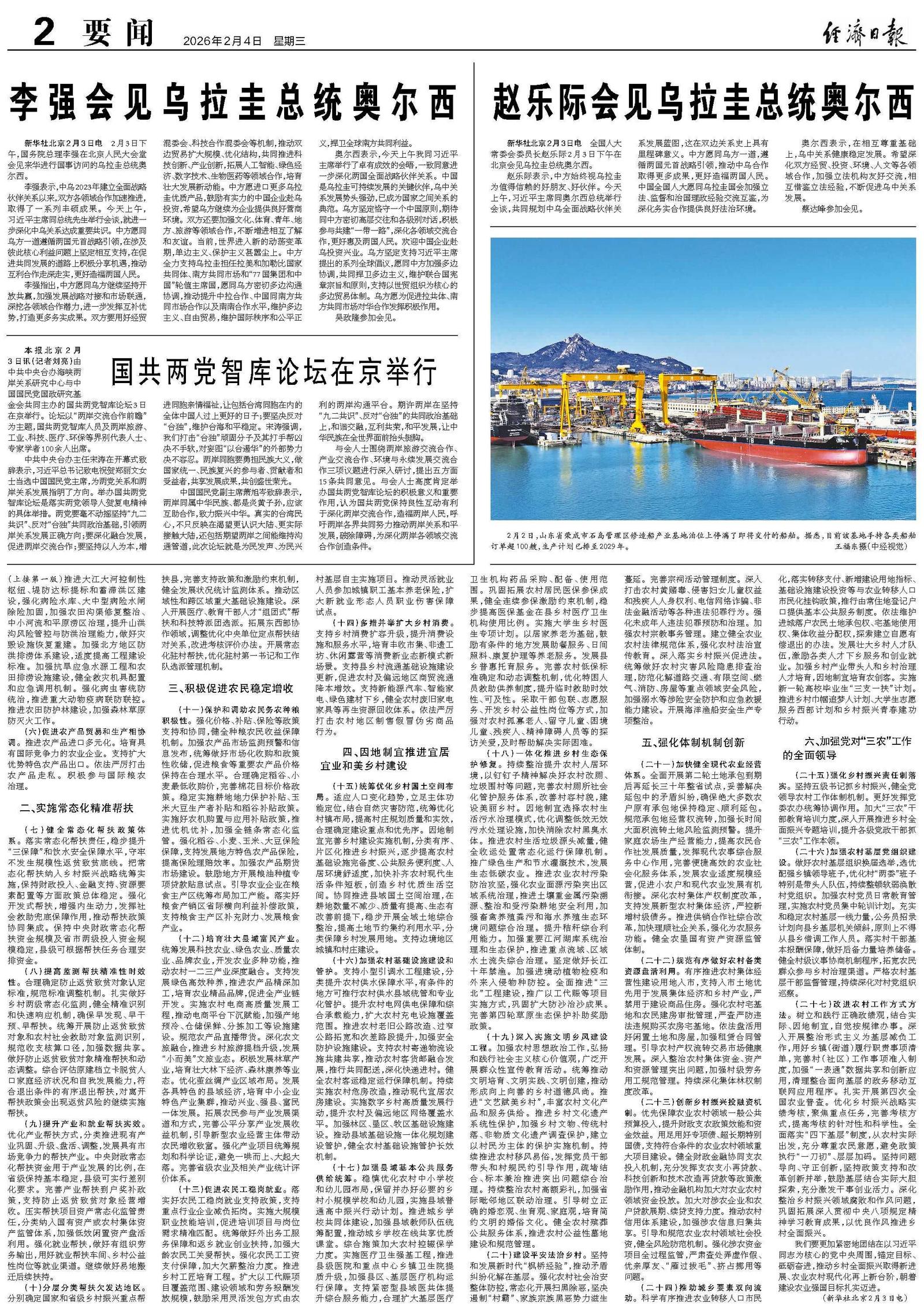 农业农村现代化关系中国式现代化全局和成色。“十四五”时期,农业综合生产能力迈上新台阶,脱贫攻坚成果巩固拓展,农民生活水平显著提高,乡村全面振兴取得明显进展。“十五五”时期是基本实现社会主义现代化夯实基础、全面发力的关键时期,要加快补上农业农村领域突出短板,加快建设农业强国。2026年是“十五五”开局之年,做好“三农”工作至关重要。要坚持以习近平新时代中国特色社会主义思想为指导,深入贯彻党的二十大和二十届历次全会精神,认真落实四中全会部署,全面贯彻习近平总书记关于“三农”工作的重要论述和重要指示精神,坚持把解决好“三农”问题作为全党工作重中之重,坚持和加强党对“三农”工作的全面领导,完整准确全面贯彻新发展理念,坚持稳中求进工作总基调,坚持农业农村优先发展,坚持城乡融合发展,锚定农业农村现代化,以推进乡村全面振兴为总抓手,以学习运用“千万工程”经验为引领,以改革创新为根本动力,提高强农惠农富农政策效能,守牢国家粮食安全底线,持续巩固拓展脱贫攻坚成果,提升乡村产业发展水平、乡村建设水平、乡村治理水平,努力把农业建成现代化大产业、使农村基本具备现代生活条件、让农民生活更加富裕美好,为推进中国式现代化提供基础支撑。
