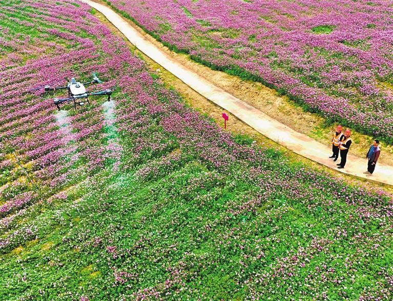 2月3日,广西来宾市忻城县城关镇范团村格桑花种植基地,智慧农服人员正操控植保无人机为花田喷洒肥料。樊绍光摄(中经视觉)