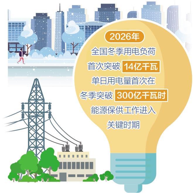 受大范围寒潮天气影响,近期全国用电快速攀升。国家能源局最新数据显示,2026年全国用电负荷三创冬季新高,冬季负荷首次突破14亿千瓦,最高达14.17亿千瓦,单日用电量首次在冬季突破300亿千瓦时,能源保供工作进入关键时期。面对冬季能源电力需求高峰,保供保暖如何实现平稳有序?