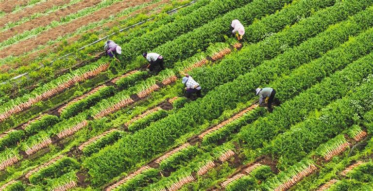 2月2日,广西南宁市宾阳县王灵镇东湖农场,农民在采收胡萝卜,田间地头一派丰收景象。