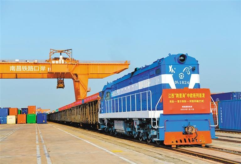 2月2日,一列满载大理石制品、棉布、墙纸等货物的“跨里海”中欧班列从江西南昌国际陆港出发,由霍尔果斯口岸出境,运输至阿塞拜疆首都巴库。朱海鹏摄(中经视觉)