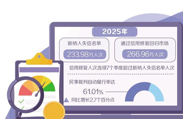 2025年新纳入失信名单233.98万人次,同时有266.96万人次通过信用修复回归市场。日前,最高人民法院公布有效解决执行难工作情况。据介绍,以交叉执行为牵引,人民法院的执行质效持续高位运行,执行规范化建设成效不断显现,着力保障当事人合法权益依法“兑现”。