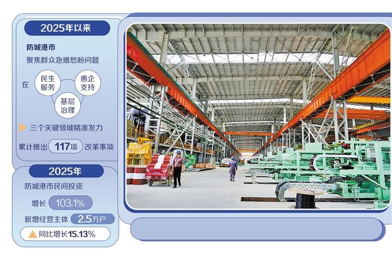 一项项微改革微创新如同精准滴灌的金融活水、优化流程的润滑剂,有效疏通了市场经济的“毛细血管”。2025年,防城港市民间投资增长103.1%,企业综合融资成本全自治区最低;新增经营主体2.5万户,同比增长15.13%。