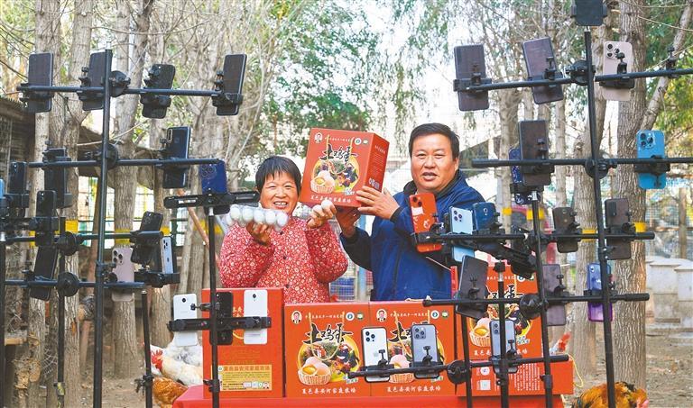 2025年11月16日,村民在河南省商丘市夏邑县太平镇太平庄村安河家庭农场直播销售林下散养土鸡蛋。