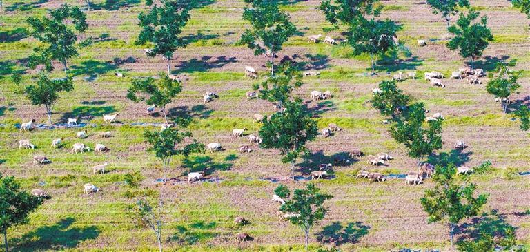 2025年10月27日,江苏省宿迁市泗洪县龙集镇,山羊在碧根果树林觅食。