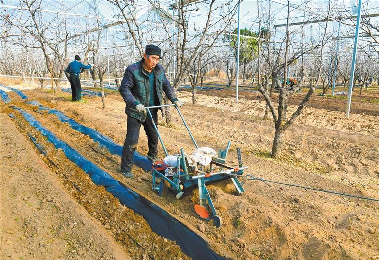 2025年11月25日,山西省运城市稷山县稷峰镇加庄村,村民给板枣林下种植的中药材覆盖地膜。