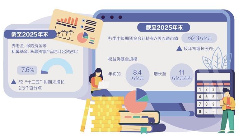 随着一系列举措落地,“长钱”入市正在取得实质性进展。1月11日,中国证监会副主席陈华平在第三十届中国资本市场论坛上披露的数据显示,截至2025年末,各类中长期资金合计持有A股流通市值约23万亿元,较年初增长36%;权益类基金规模也从年初的8.4万亿元增长至11万亿元左右。1月29日,中国证券投资基金业协会公布的数据显示,截至2025年末,养老金、保险资金等长期资金对公募基金、私募基金、私募资管产品合计出资占比7.6%,较“十三五”时期末增长2.5个百分点。整体来看,中长期资金规模持续扩容,资金结构向长期化、稳定化方向演进。
