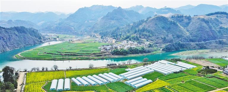 2月8日,在贵州省黔东南苗族侗族自治州岑巩县注溪镇周坪村,油菜花海与村庄、公路构成一幅美丽的田园画卷。