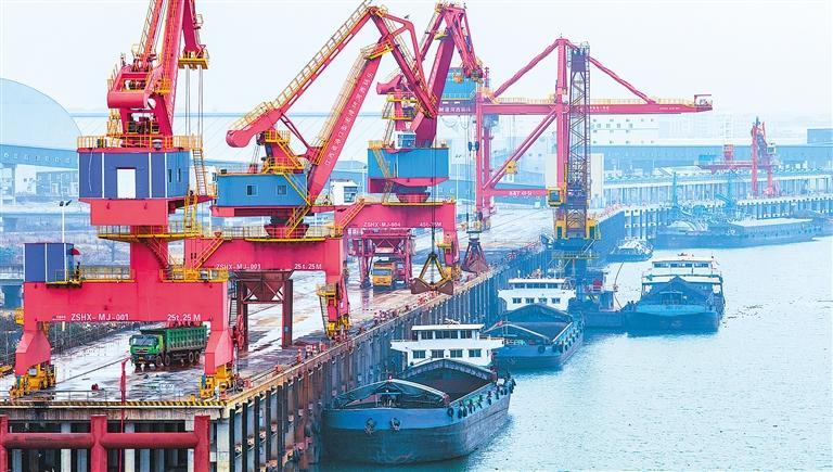 2月11日,江西省宜春市宜春港樟树港区河西作业区综合码头,吊机在装卸煤炭。春节临近叠加持续低温天气,宜春港加大电煤保供力度,确保能源快速转运和高效配送。周 亮摄(中经视觉)