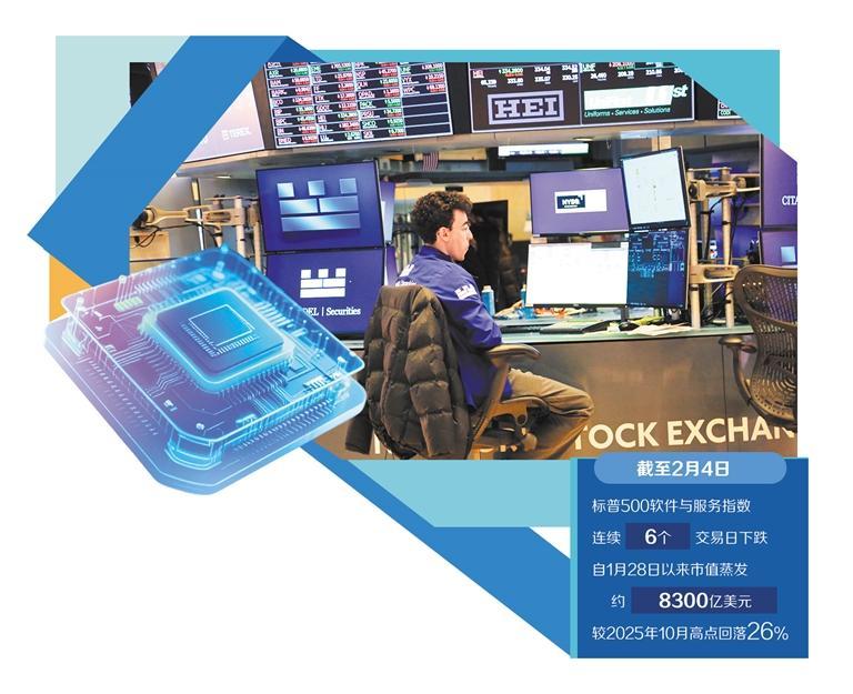 从市场来看,此次抛售潮范围广、跌幅深,避险情绪显著升温。数据显示,截至2月4日,标普500软件与服务指数连续6个交易日下跌,自1月28日以来市值蒸发约8300亿美元,较2025年10月高点回落26%。相关领域龙头企业股价大幅下挫,汤森路透连续多个交易日下跌且单日暴跌近16%,英国励讯集团、伦敦证券交易所单日跌幅均超12%。恐慌情绪迅速蔓延至全球市场,欧洲思爱普、赛捷集团等软件巨头股价持续走低,印度、日本等国股市中相关概念股均遭受重创。