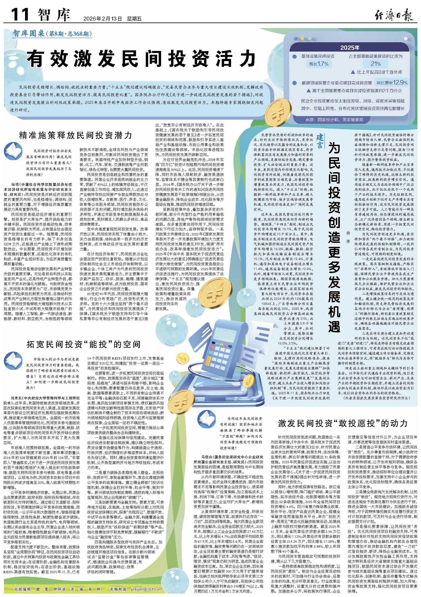 民营资本凭借对利润和效率的追求,时时关注市场供需状况、竞争状况、变化趋势以及蕴含的发展机会,以投资为抓手积极满足现实需求,将资源配置到具有发展潜力和盈利前景的产业领域,是推动经济发展、稳定整体投资、扩大社会就业的重要力量。近年来,虽然受国内外环境变化影响,民间投资有所放缓,但随着促进民间投资的政策框架日趋完善,存量政策和增量政策共同发力,我国民间投资结构持续优化。进入“十五五”时期,把握新一轮科技革命和产业变革、超大规模国内市场、城乡区域协调发展等机遇,民间投资迎来更加广阔的发展空间。