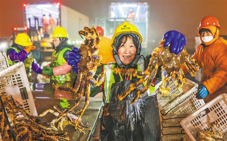 2月14日,山东省荣成市石岛管理区石岛新港口岸,工作人员在分拣帝王蟹。该口岸开通联检绿色通道,保障生鲜货品安全高效入境,供应春节市场。