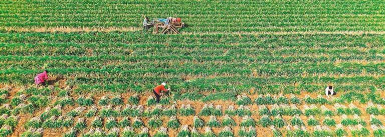 2月13日,河南省南阳市新野县城郊乡张楼村,村民在田间抢收钢葱。