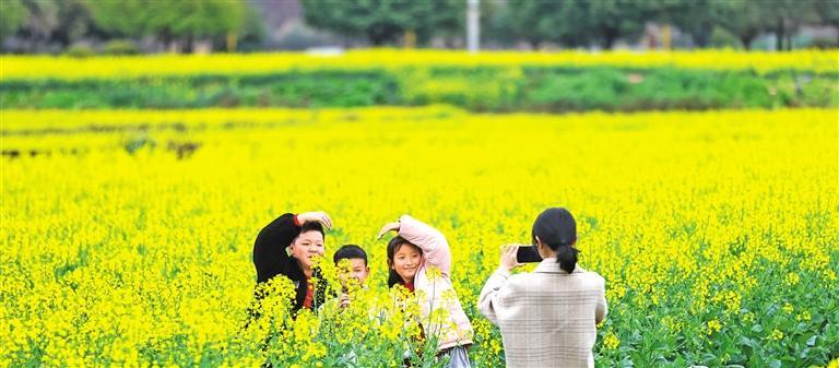 2月17日,贵州省黔东南苗族侗族自治州榕江县车江大坝,油菜花竞相绽放,人们踏青赏花,乐享假日时光。