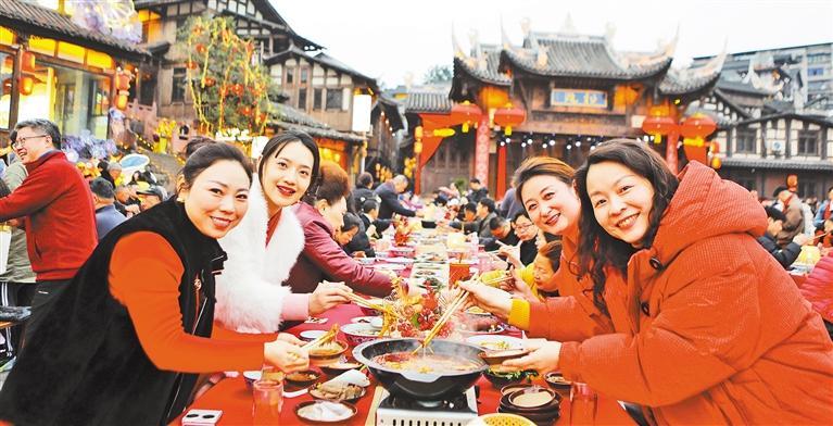 2月16日,重庆市永川区松溉古镇,80余桌长桌宴席沿街铺开,非遗美食热气腾腾,邻里乡亲与八方游客共聚一堂,欢度佳节。