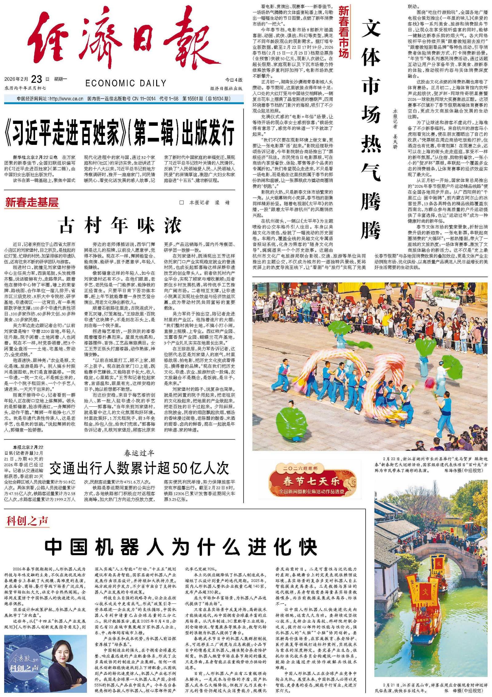 本报北京2月22日讯(记者齐慧)2月21日,为期40天的2026年春运已经过半。记者从交通运输部获悉,春运前20天全社会跨区域人员流动量累计为50.8亿人次。具体来看,公路人员流动量累计为47.55亿人次,铁路客运量累计为2.58亿人次,水路客运量累计为1999.2万人次,民航客运量累计为4751.6万人次。
