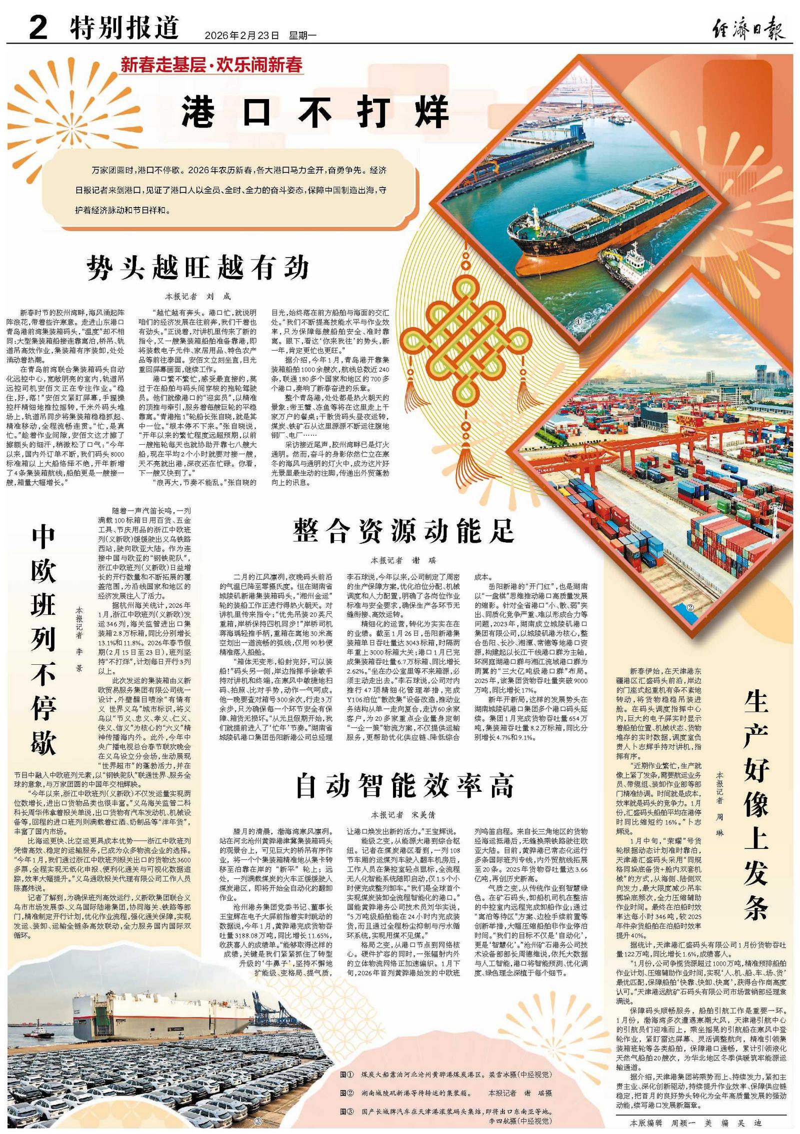 新春伊始,在天津港东疆港区汇盛码头前沿,岸边的门座式起重机有条不紊地转动,将货物稳稳吊装进舱。在码头调度指挥中心内,巨大的电子屏实时显示着船舶位置、机械状态、货物堆存的实时数据,调度室负责人卜志辉手持对讲机,指挥有序。