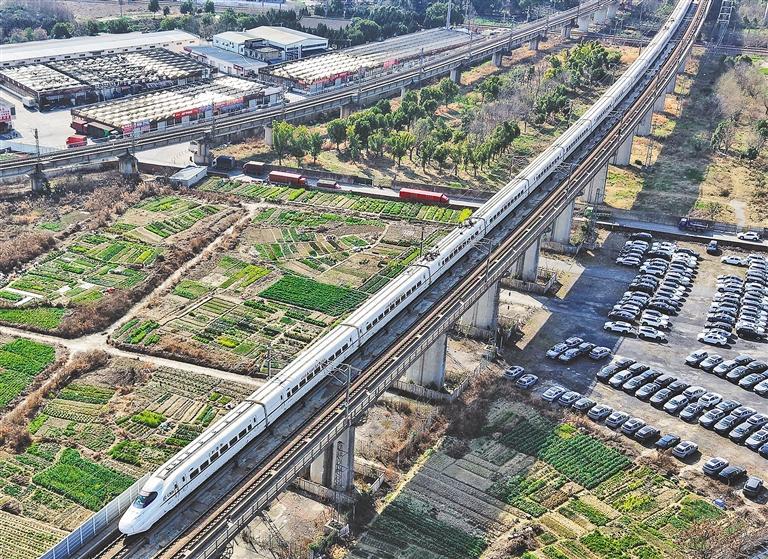 2月23日,浙江省杭州市,高铁列车行驶在铁轨上。当日是春节假期最后一天,全国铁路迎来返程客流最高峰,预计发送旅客1850万人次。