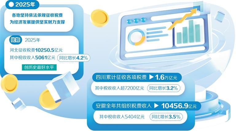 税费收入筹集是国家财力保障的基石,对提供公共服务、推进重大战略、优化资源配置、促进高质量发展意义重大。2025年,各地坚持依法依规征收税费,为经济发展提供坚实财力支撑。比如,2025年,河北征收税费10250.5亿元,其中税收收入5061亿元,同比增长4.2%,创历史最好水平;四川累计征收各项税费1.6万亿元,其中税收收入超7200亿元,同比增长3.2%;安徽全年共组织税费收入10456.9亿元,其中税收收入5404亿元,同比增长3.5%。各地税收收入稳健增长,有力说明经济发展持续向好的基础更加牢固。