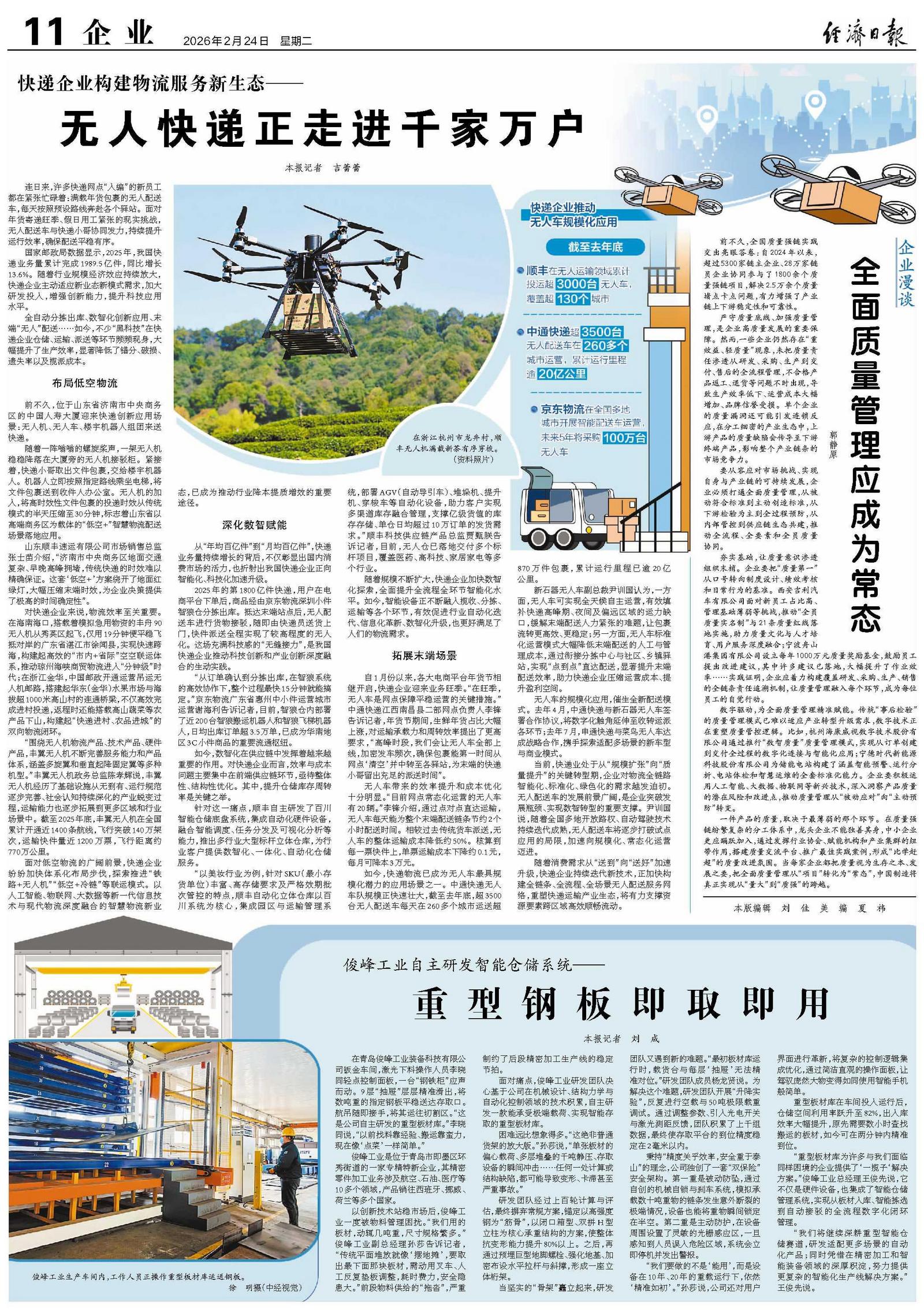 面对低空物流的广阔前景,快递企业纷纷加快体系化布局步伐,探索推进“铁路+无人机”“低空+冷链”等联运模式。以人工智能、物联网、大数据等新一代信息技术与现代物流深度融合的智慧物流新业态,已成为推动行业降本提质增效的重要途径。
