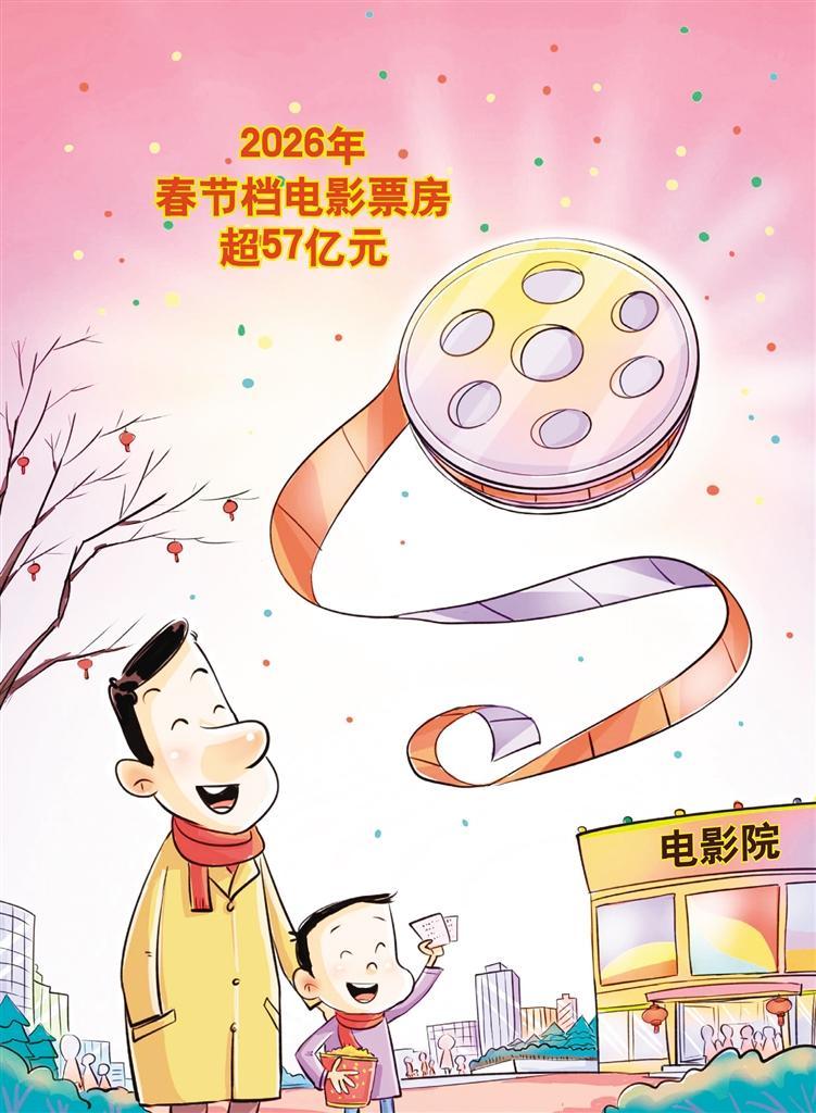 国家电影局近日发布数据显示,2026年春节档票房为57.52亿元,平均票价同比降低6%,观影人次为1.20亿。《飞驰人生3》票房领跑,《惊蛰无声》《镖人:风起大漠》《熊出没·年年有熊》《熊猫计划之部落奇遇记》《星河入梦》位列第2位至第6位。今年春节档影片题材多样、类型丰富,有效满足了不同年龄层、不同群体过年观影的需求。春节档的火热为新一年的电影市场开了个好头,要将这股热潮转化为持久动力,需多方协同发力。创作者需继续深耕内容,从传统文化与火热实践中汲取养分,打造更多兼具中国特色与时代创新的精品。各地应深化“电影+”模式,推广票根联动文旅消费的经验,将光影热度转化为发展增量。电影行业要加快技术升级与市场下沉,让更多观众在家门口共享高品质的光影盛宴。(时 锋)