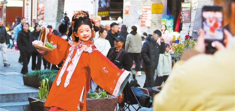 ▲2月18日,河南省许昌市曹魏古城,小游客身着汉服拍照留念。