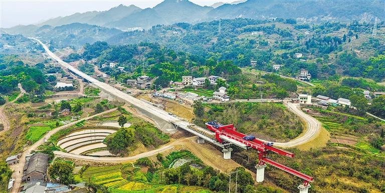 2月26日,重庆市合川区清平镇的西渝高铁建设工地,架梁机在进行架梁作业。新春伊始,西渝高铁重庆段建设迅速复工复产,建设者已陆续返岗,正全力推进制梁架梁施工。新华社记者 唐 奕摄