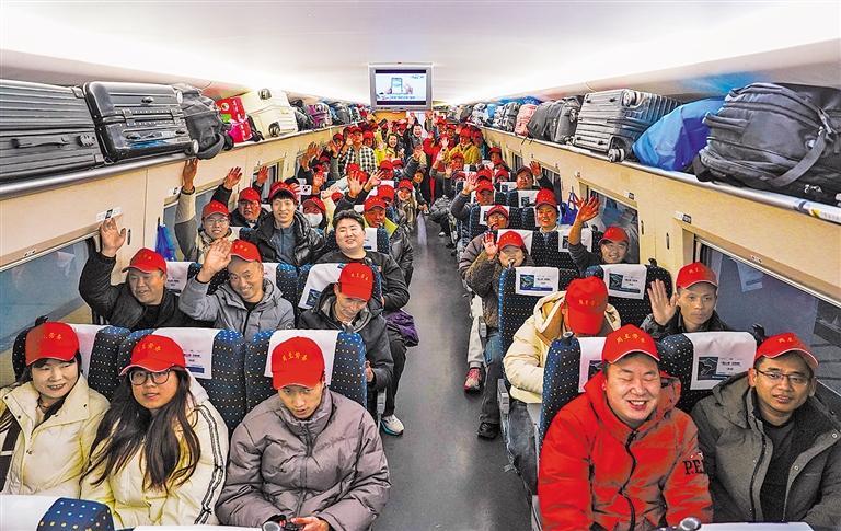 2月24日,中国铁路西安局集团有限公司联合周至县人力资源和社会保障局,开行2026年首趟“春风行动”赴苏州、太仓务工人员“点对点”定制专列。专列通过打造一站式闭环运输服务,全力保障务工人员安全、便捷、有序返岗就业。刘一江摄(中经视觉)