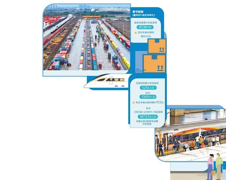 同时,铁路部门统筹做好重点物资和节日物资保供运输,累计发送货物8538万吨,较去年春运期间增长0.5%,铁路客货运输实现量质齐升,为旅客出行和假日经济平稳运行提供了有力支撑。