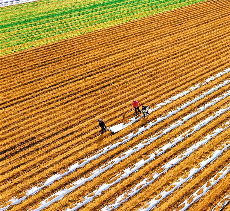 2月25日,山东省临沂市平邑县保太镇农民在为种植的土地覆盖地膜,抢抓农时春耕春种,田间地头一派人勤春早农忙景象。
